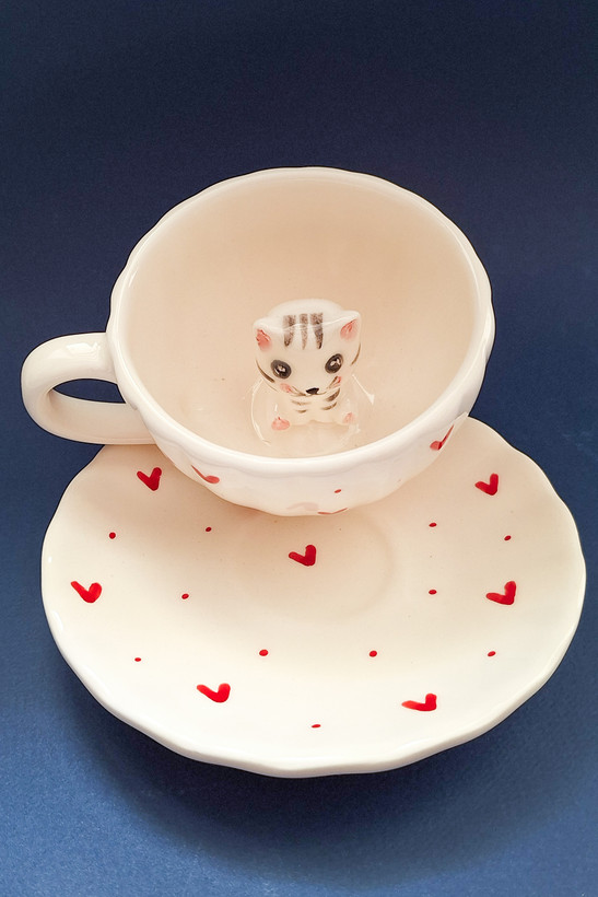 سوپرایزی سرامیکی تک نفره دو تیکه لاته خوری و نعلبکی گربه